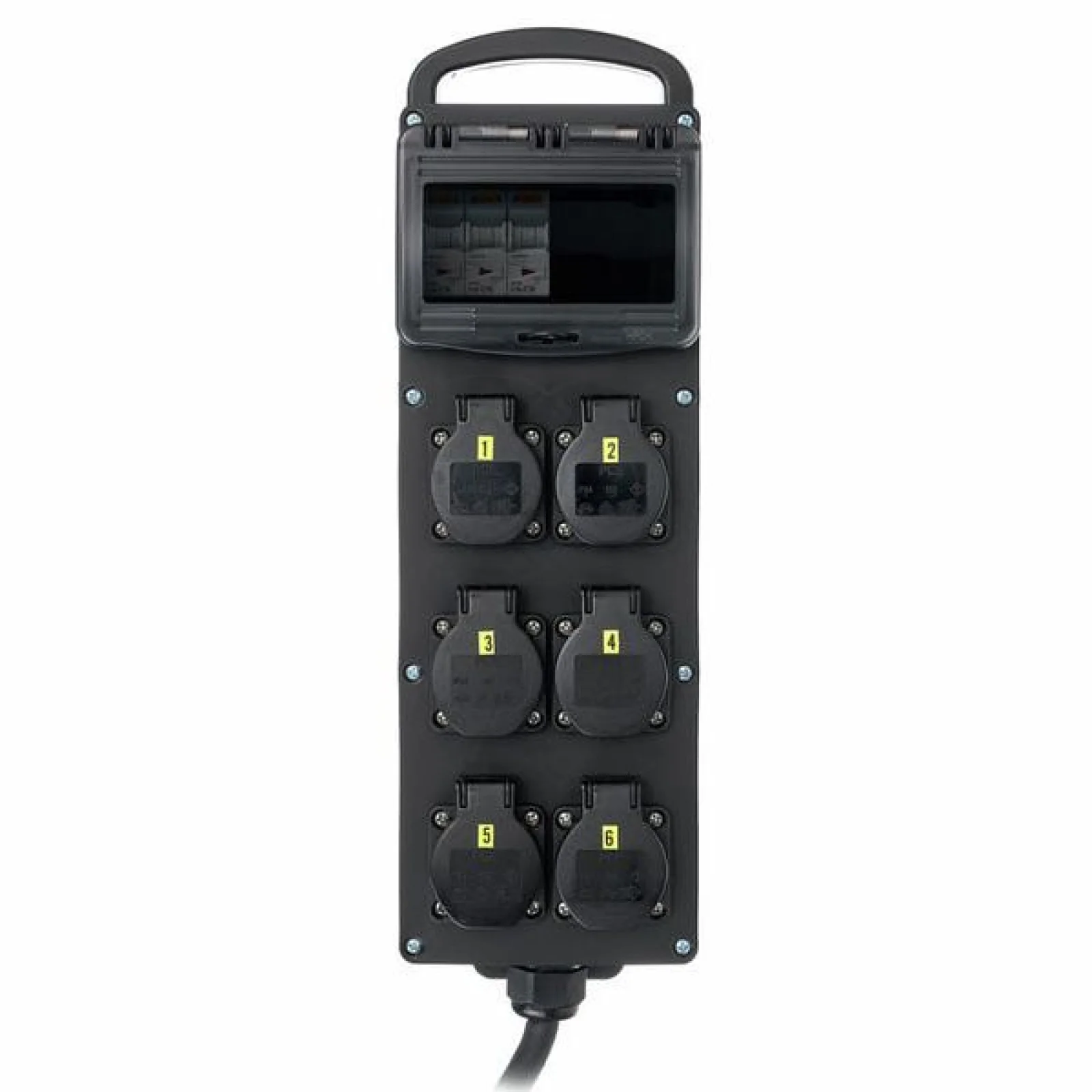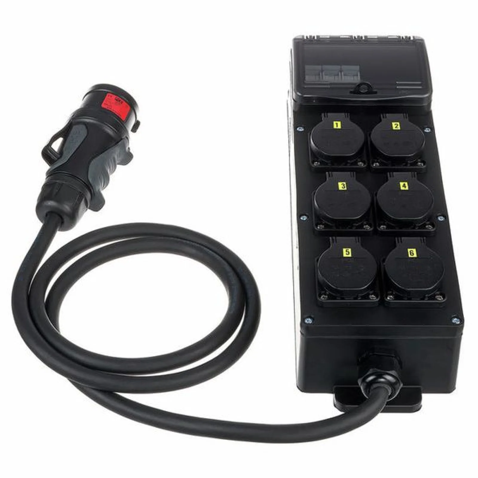 Power Splitter / Power Distributor Cable: 5G2.5 with 5-pin CEE connector (16 A 400 V) Cable length: 2 m Fuses: 3x LS 16A 1 phase, type c Equipped with: 6x Safety plug sockets 16 A, 240 V IP Protection Rating: IP54 Dimensions: 430 x 130 x 75 mm