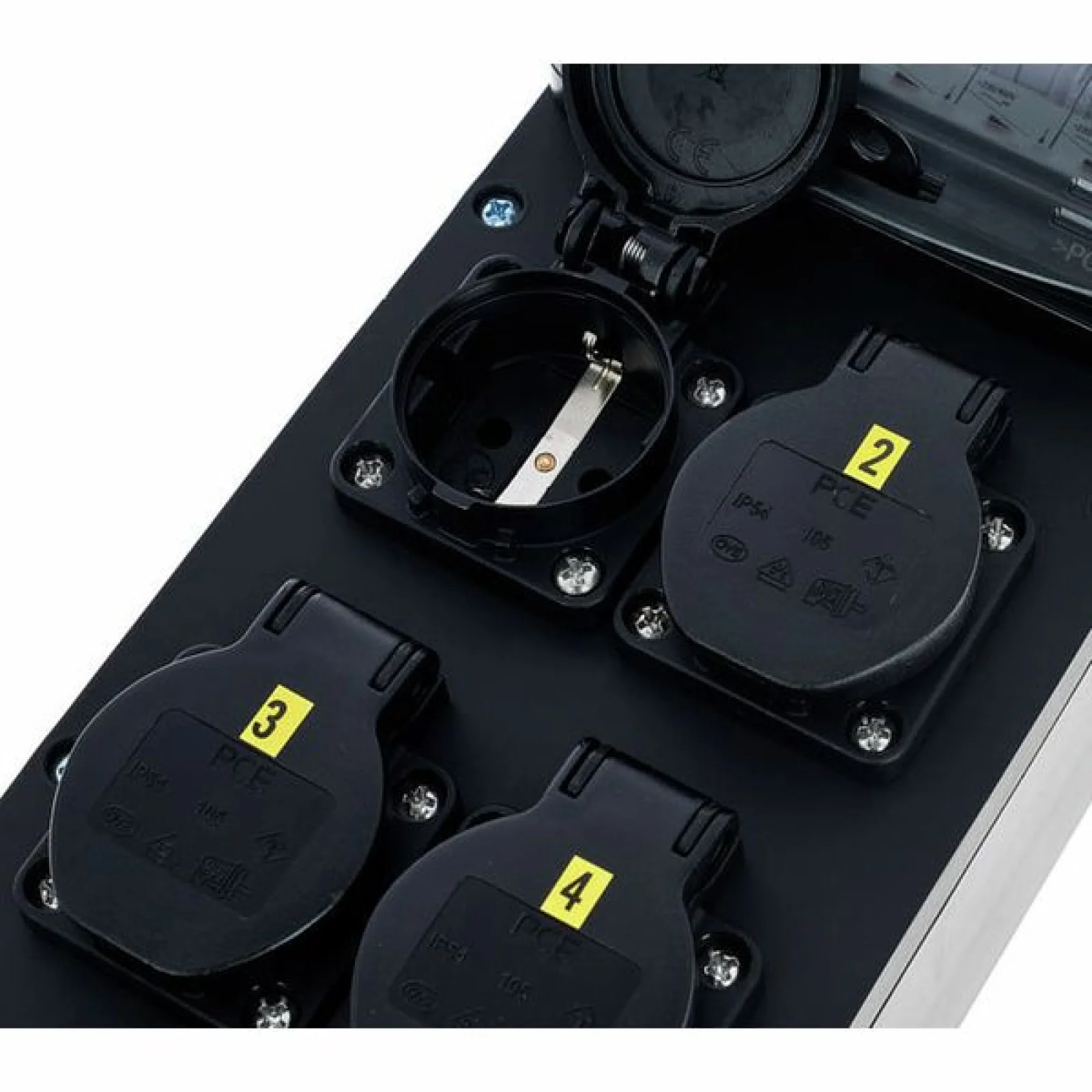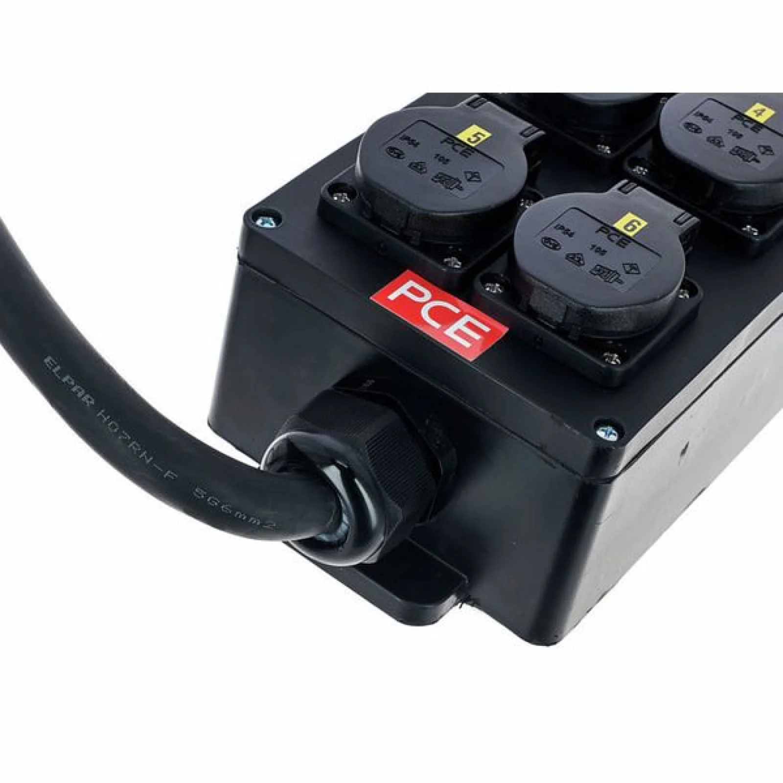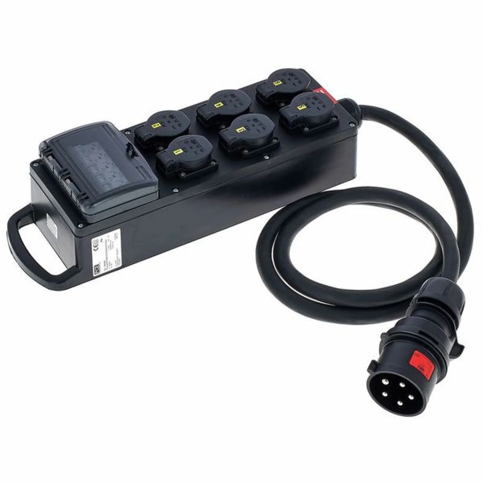 Power Splitter / Power Distributor Cable: 2 m 5G6 with 5-pin CEE connection (32A 400V) Fuse: 6x MCB 16A 1-pole, type C Equipment: 6x protective contact sockets 16A, 240V IP protection class: IP54 Dimensions: 430 x 130 x 75 mm
