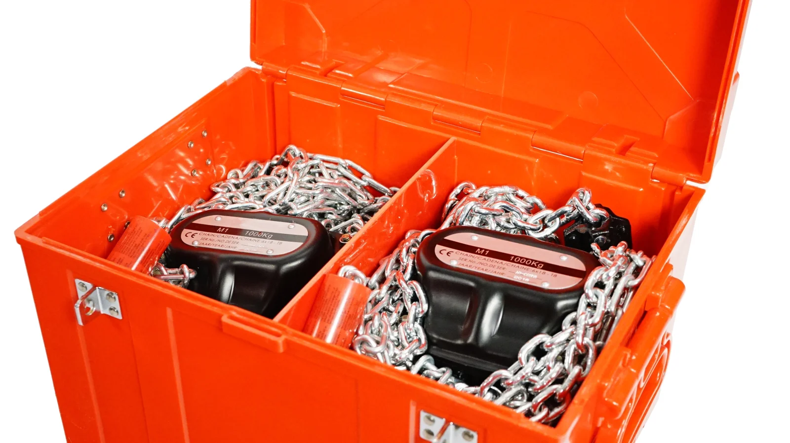 Red box with 2 pcs CE certified manual chain hoists with 9m chain and 1000 kg lifting capacity.