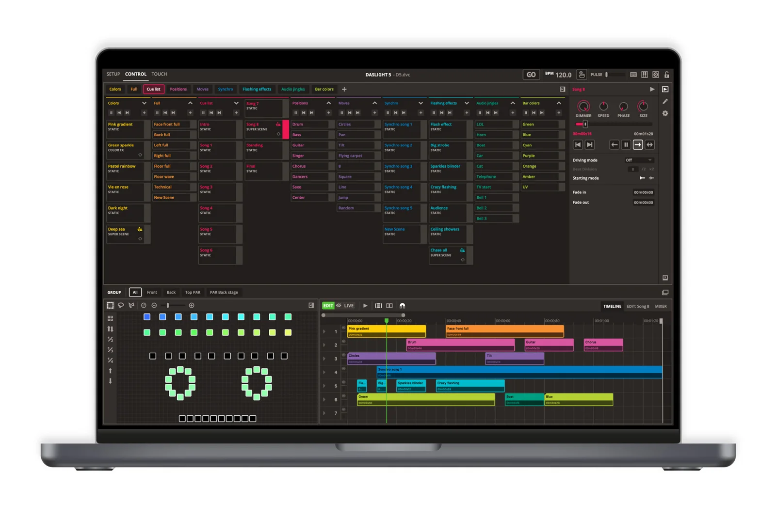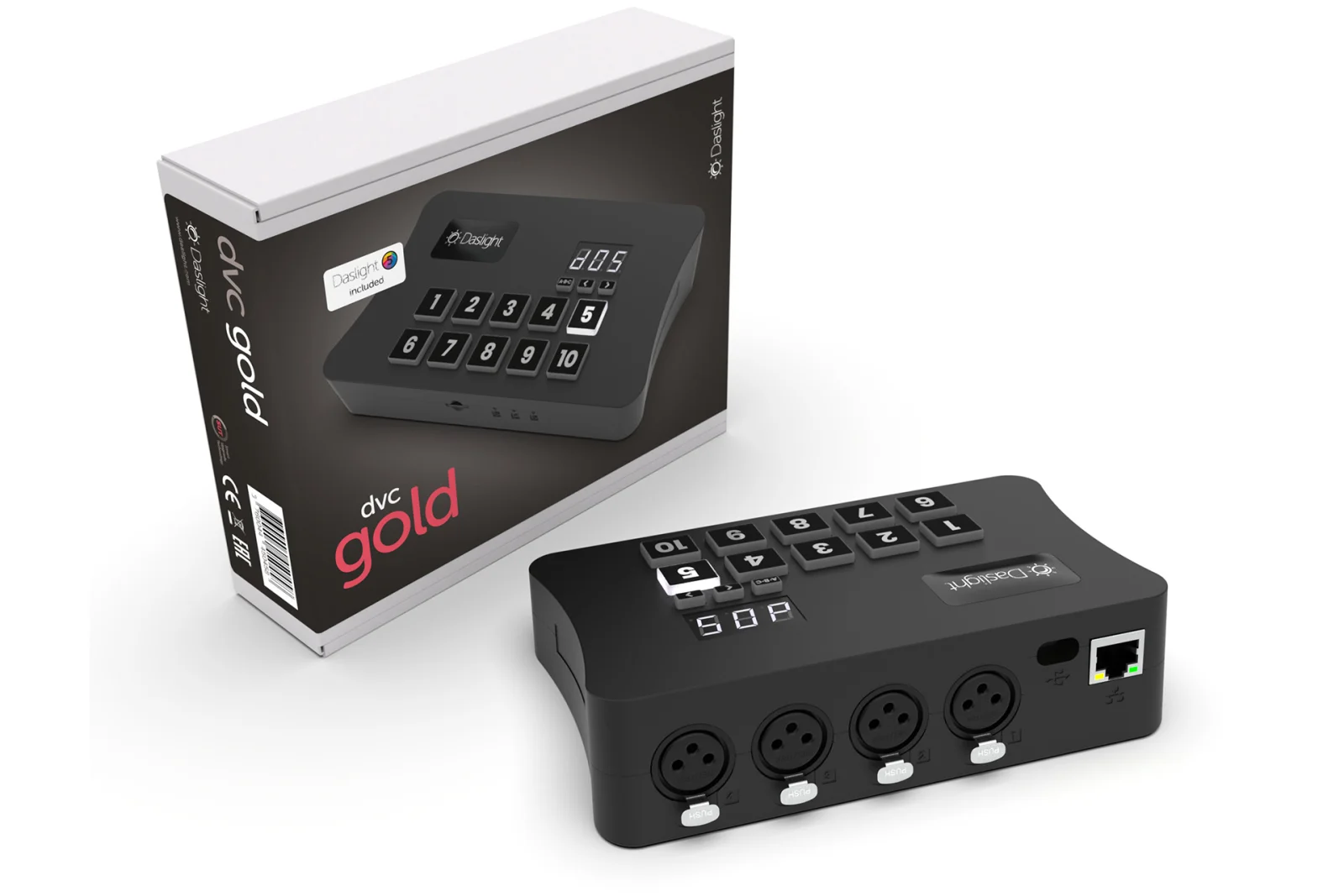 Daslight DVC GOLD, 1024 channels, Sleek design, 1024 DMX OUT channels (2 universes) expandable to 2048 channels and other software supporting the SUT technology (see dmxsoft.com). SD card standalone memory. Works with Daslight 4 and Daslight 5 software. USB-C and ethernet connection. Delivered with a USB-C cable. Power supply for standalone not included. Compatible with Windows 10&11 32/64-bit and macOS 10.15 or higher.