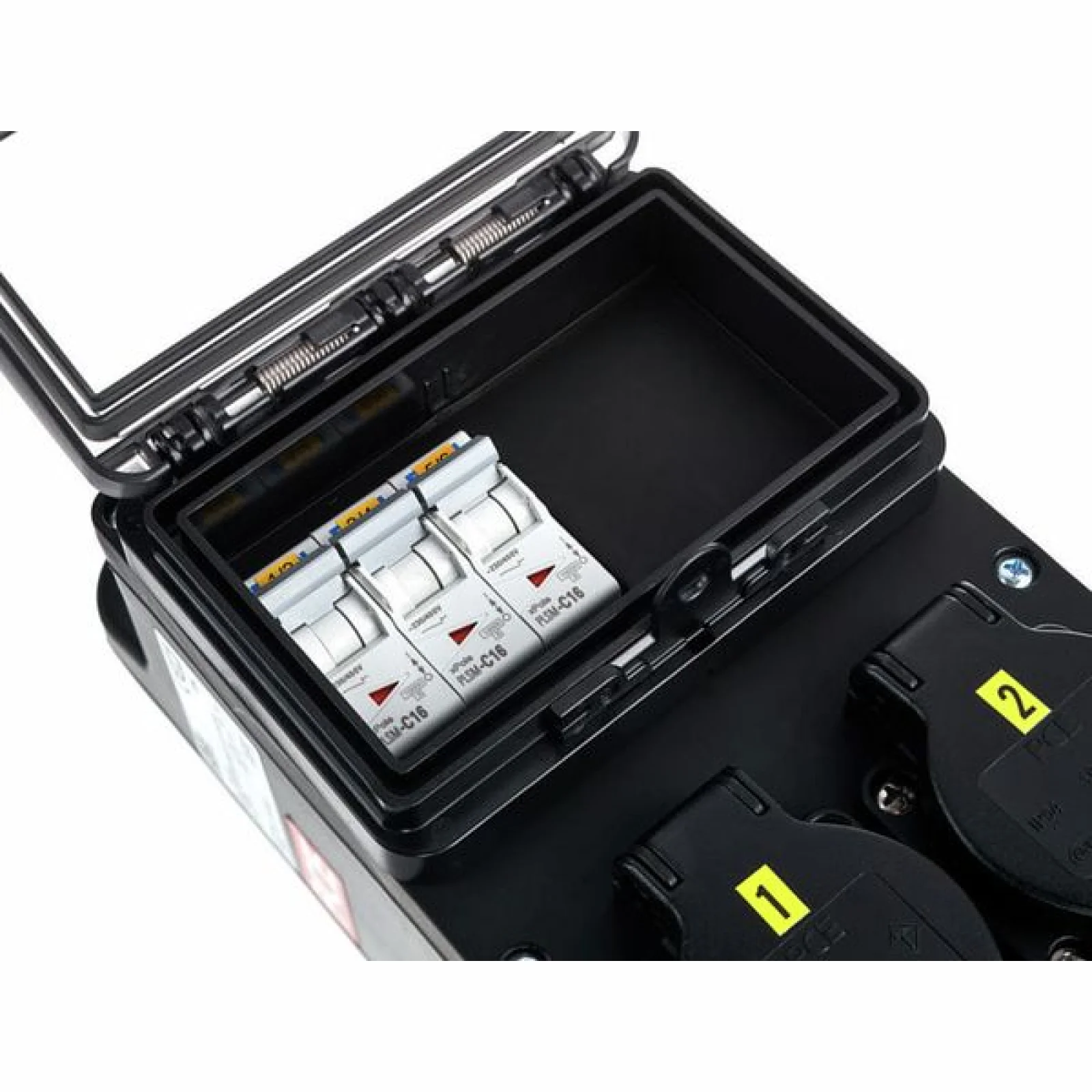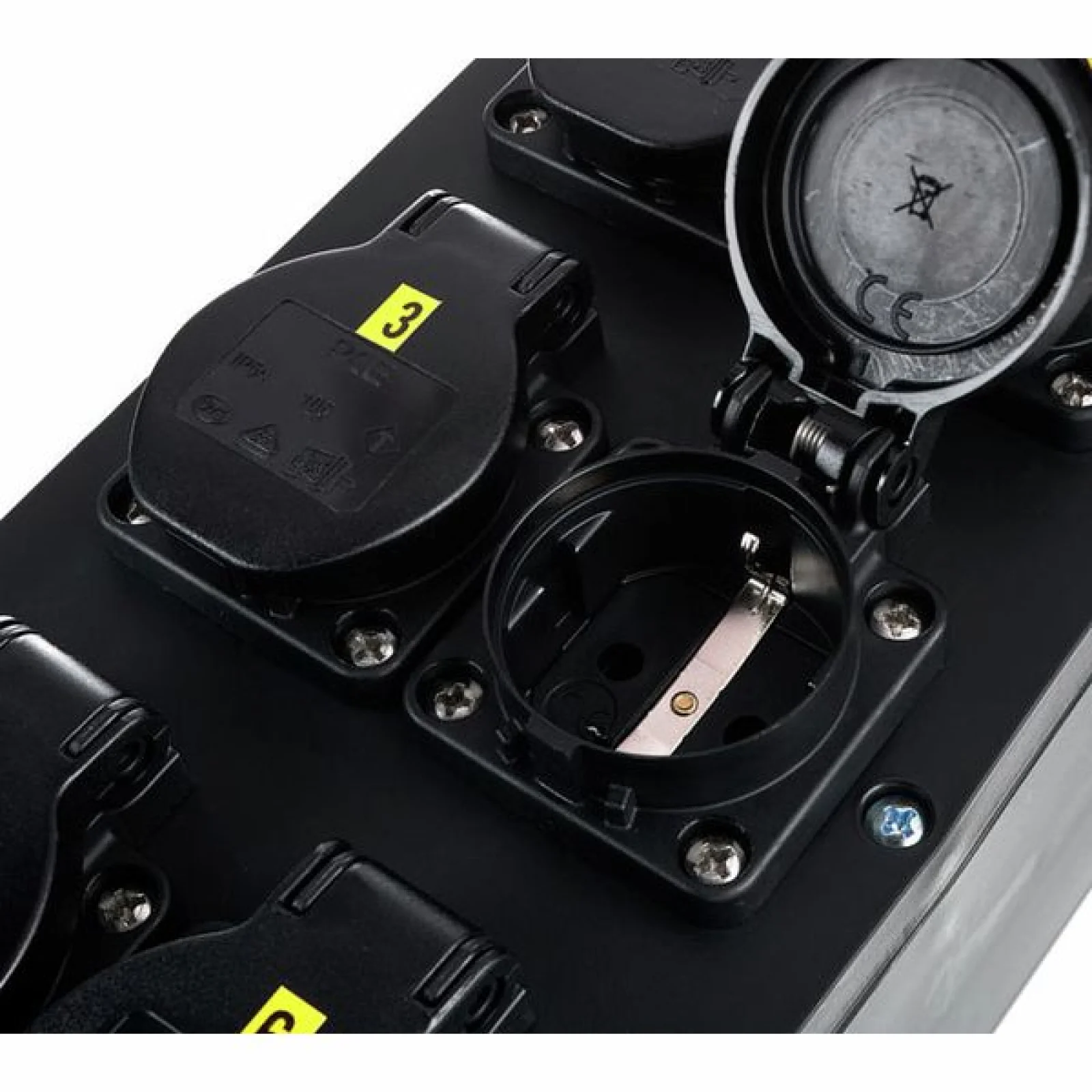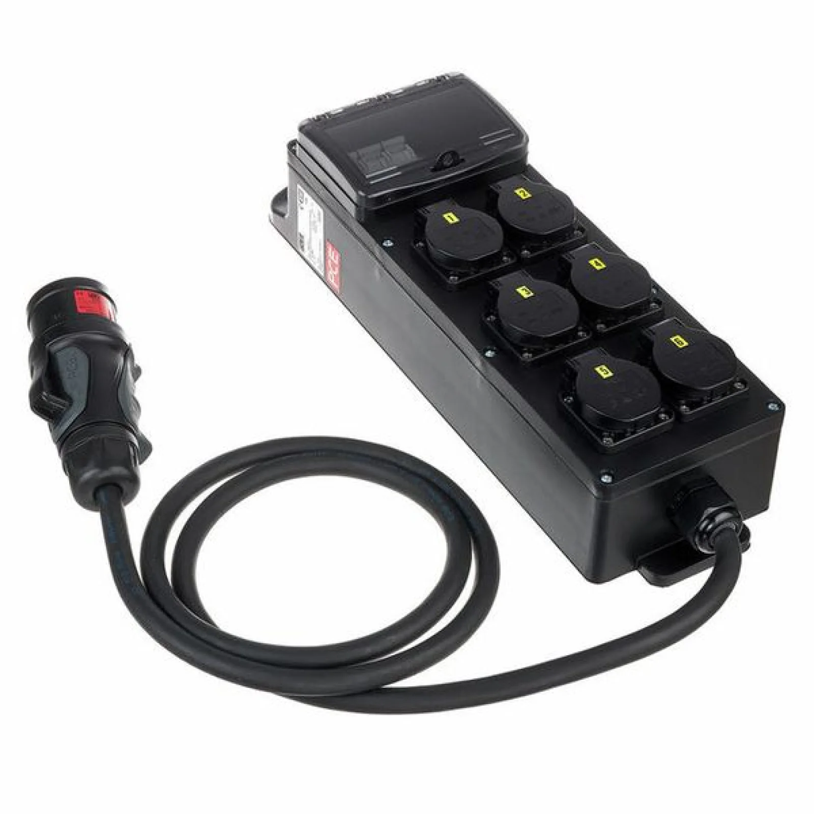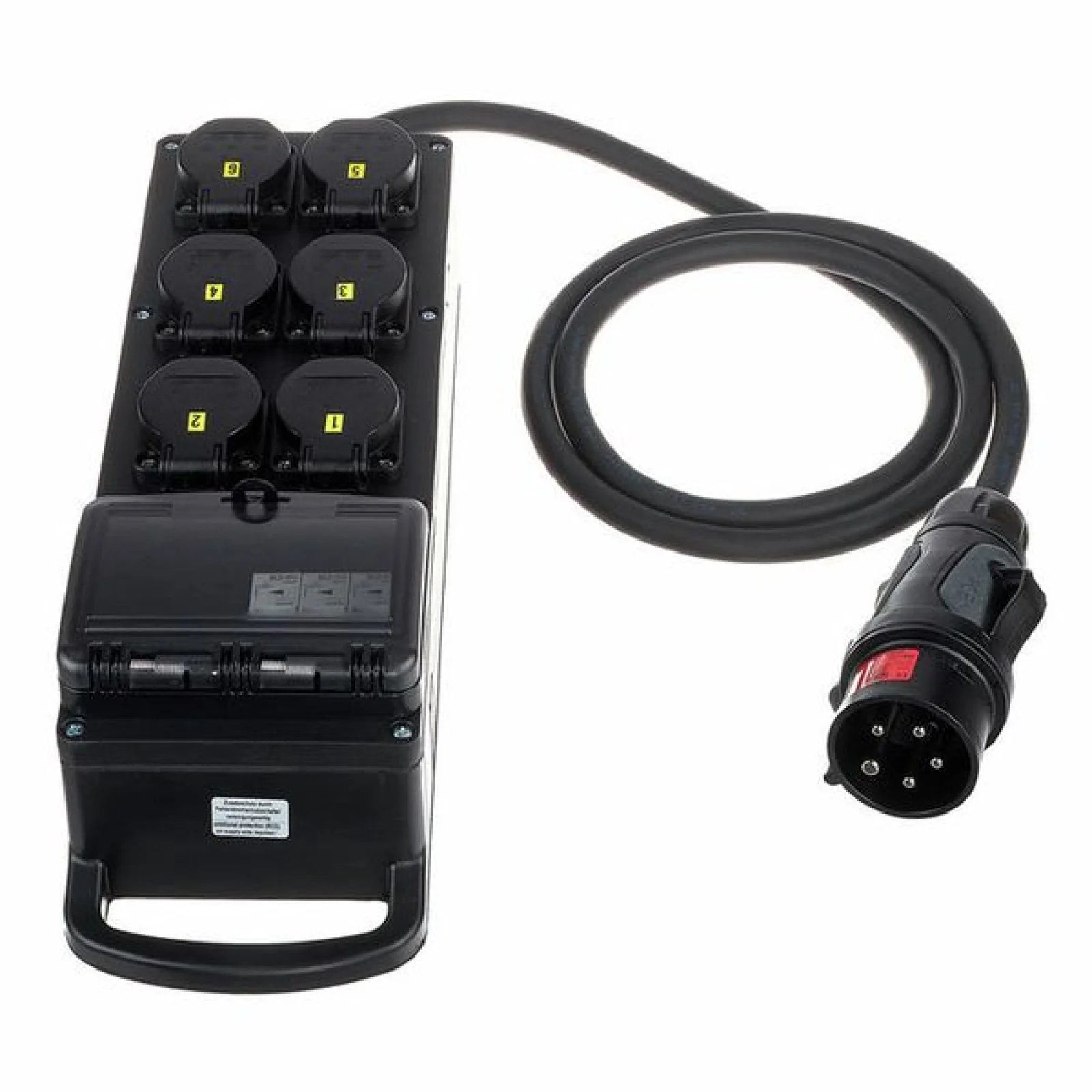 Power Splitter / Power Distributor Cable: 5G2.5 with 5-pin CEE connector (16 A 400 V) Cable length: 2 m Fuses: 3x LS 16A 1 phase, type c Equipped with: 6x Safety plug sockets 16 A, 240 V IP Protection Rating: IP54 Dimensions: 430 x 130 x 75 mm