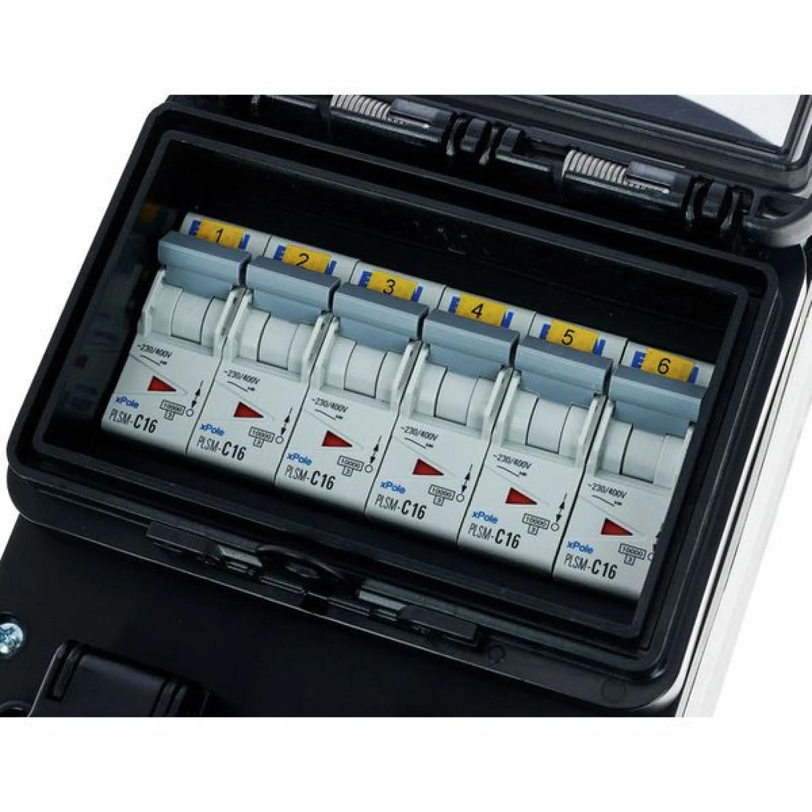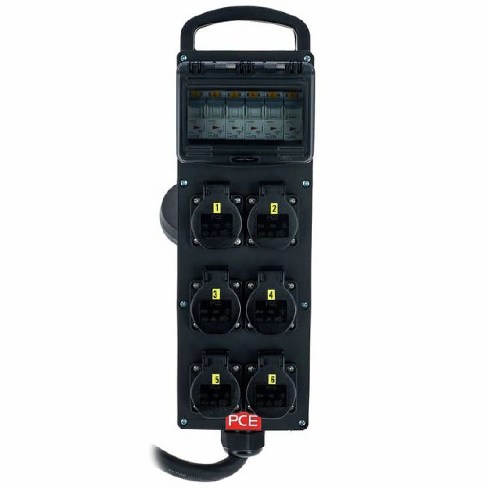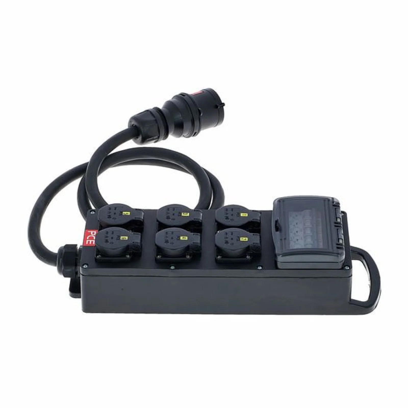 Power Splitter / Power Distributor Cable: 2 m 5G6 with 5-pin CEE connection (32A 400V) Fuse: 6x MCB 16A 1-pole, type C Equipment: 6x protective contact sockets 16A, 240V IP protection class: IP54 Dimensions: 430 x 130 x 75 mm