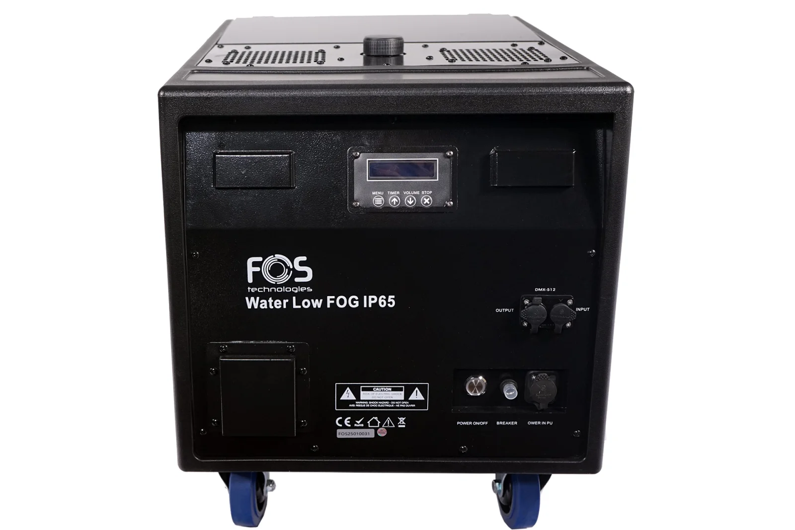 Weatherproof IP65 Low Fog 3000 watt smoke machine that needs only water & fog liquid supply for 300 sqm stages, no need Co2 or Dry ice use ultrasonic technology. DMX 512, Remote Control LCD screen, heat up time 5 mins, fluid consumption 1-95ml/min, fluid-less and water-less protection, plastic and stainless construction, quick connect hoses, plastic nozzles, low noise operation, adjustable fog output, and fan speed.