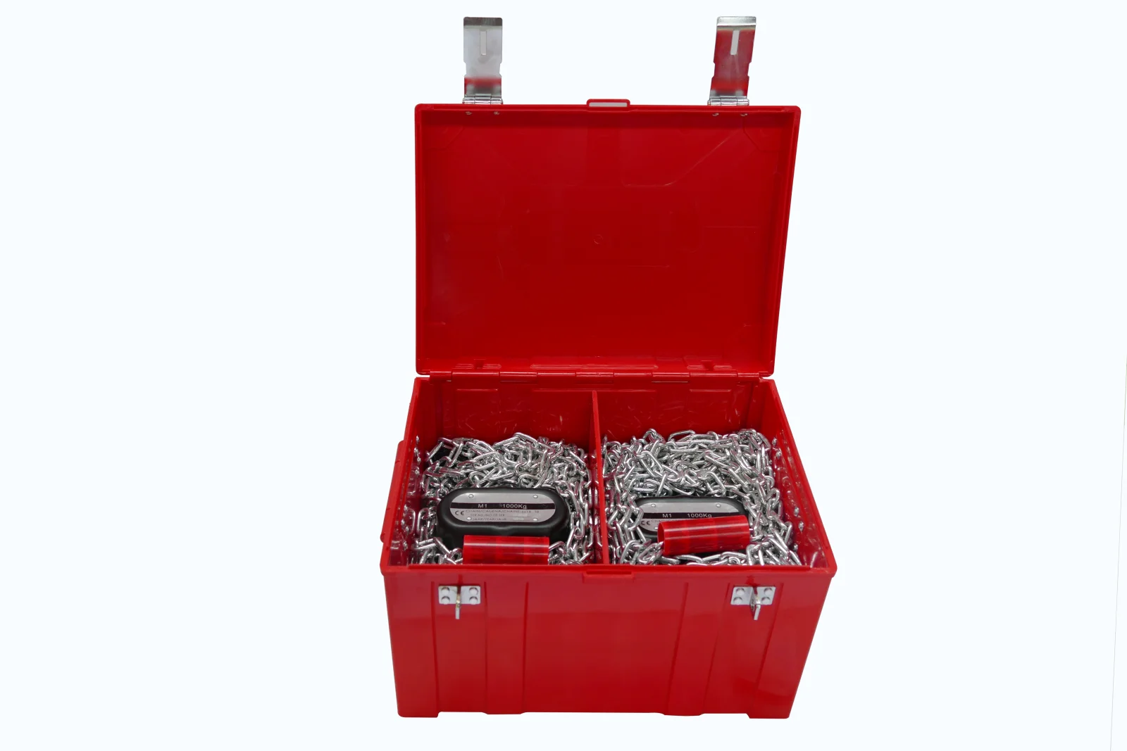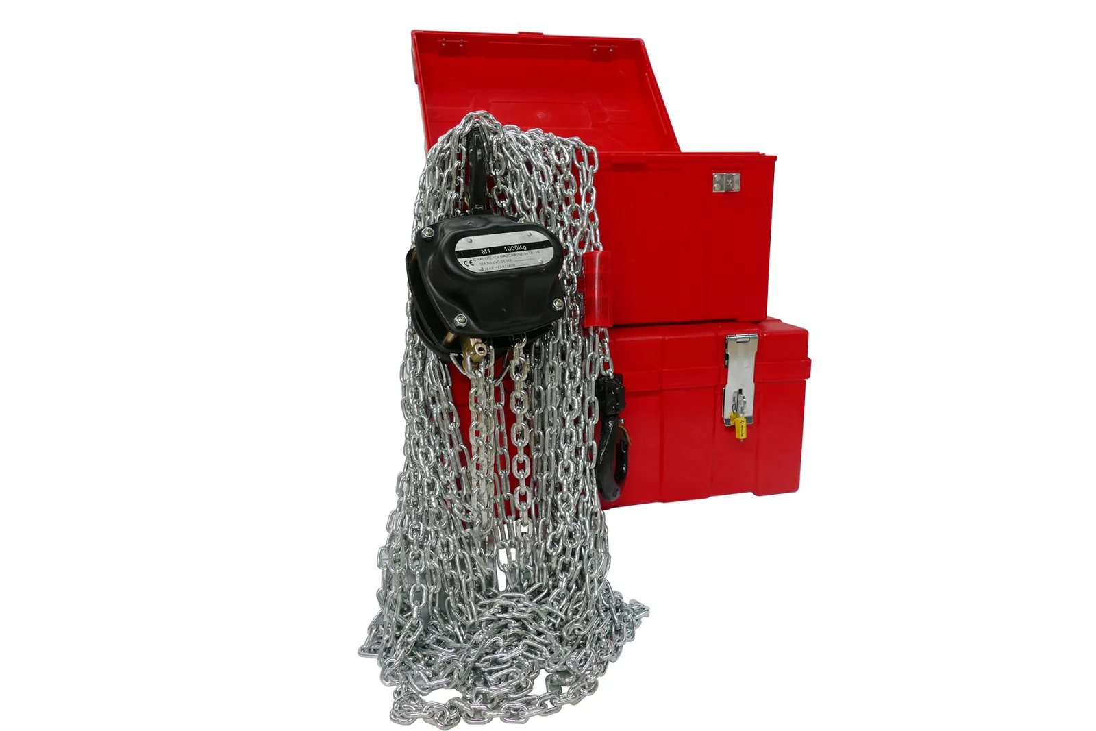 Red box with 2 pcs CE certified manual chain hoists with 9m chain and 1000 kg lifting capacity.