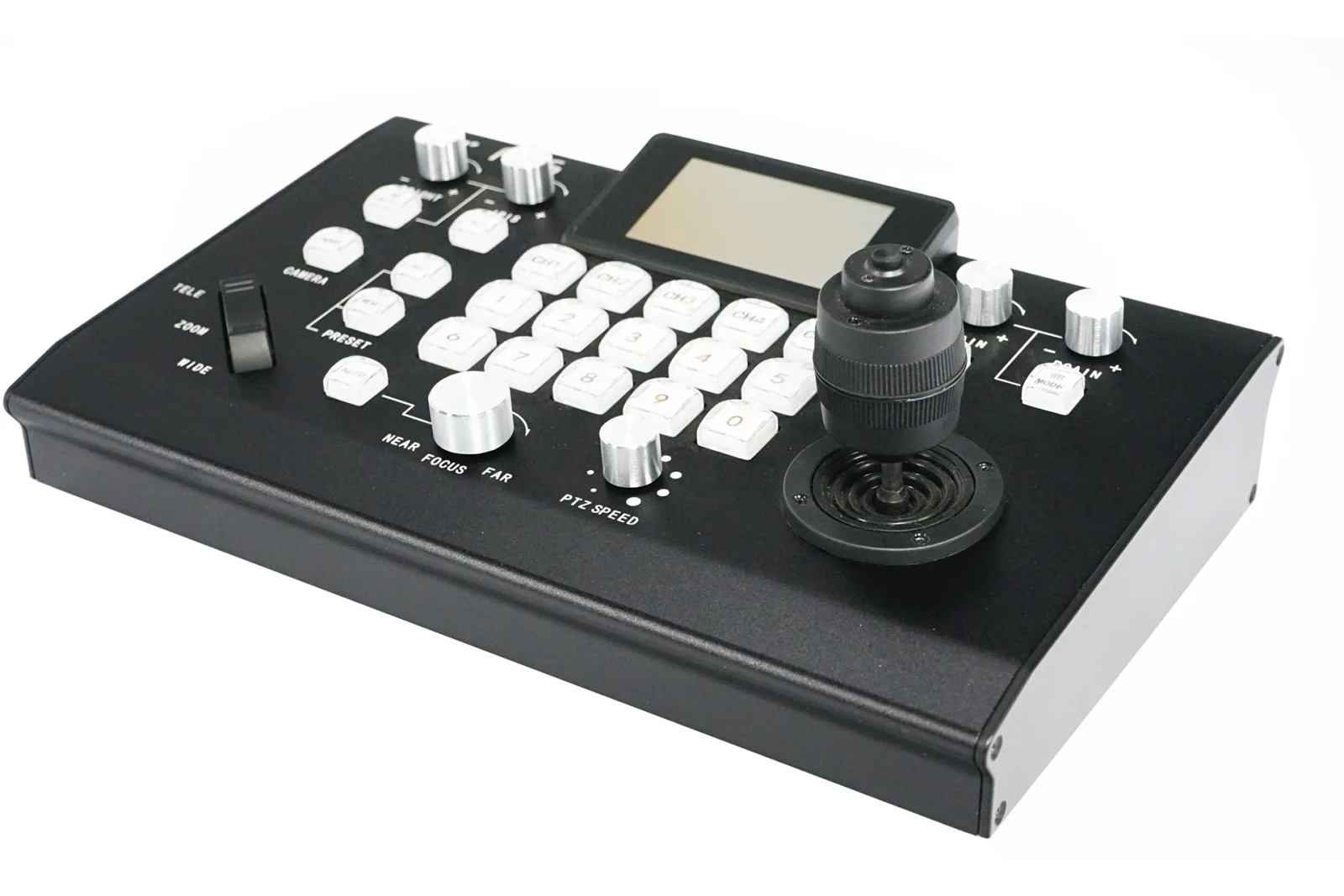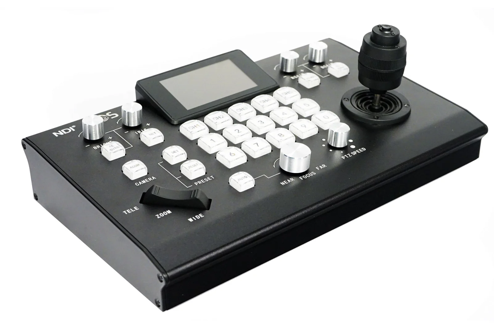 IP Joystick Controller for NDI PTZ cameras, lcd screen, 28 keys, Double color backlight, 10 level of brightness , up to 64 controllable cameras, protocol VISCA, PELCOP/D, Polycom, Cisco, Canon, Panasonic, high accuracy joystick.