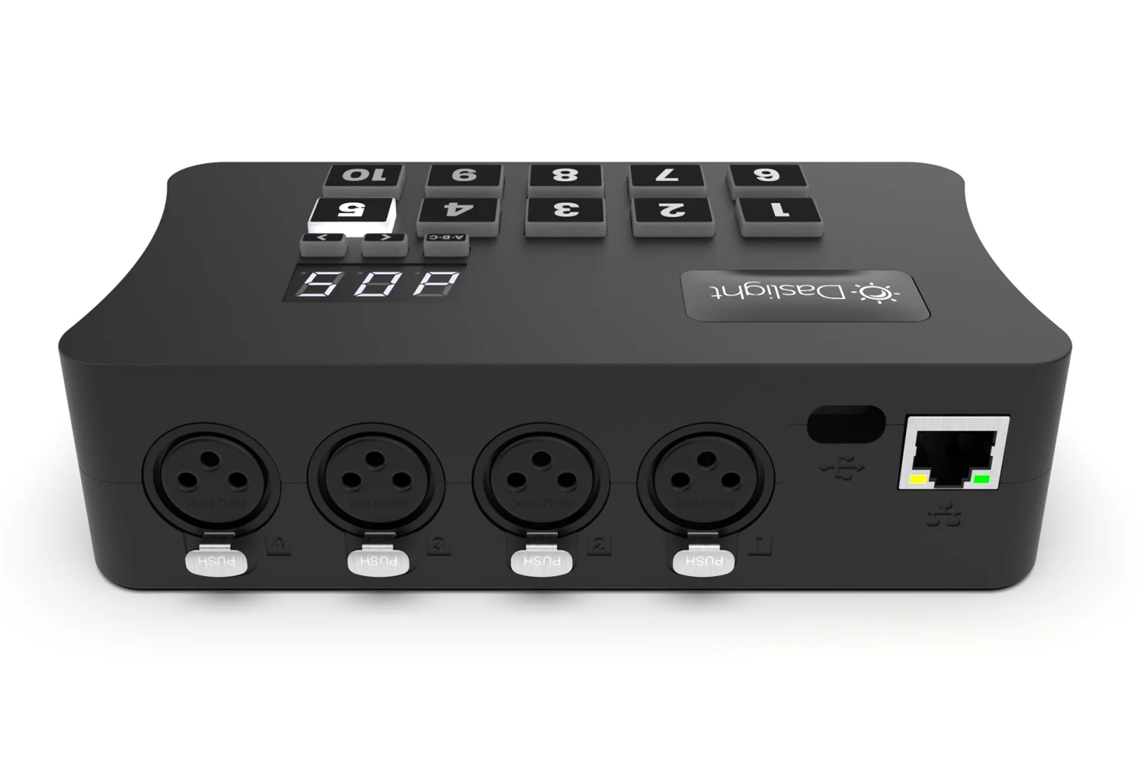 Daslight DVC GOLD, 1024 channels, Sleek design, 1024 DMX OUT channels (2 universes) expandable to 2048 channels and other software supporting the SUT technology (see dmxsoft.com). SD card standalone memory. Works with Daslight 4 and Daslight 5 software. USB-C and ethernet connection. Delivered with a USB-C cable. Power supply for standalone not included. Compatible with Windows 10&11 32/64-bit and macOS 10.15 or higher.