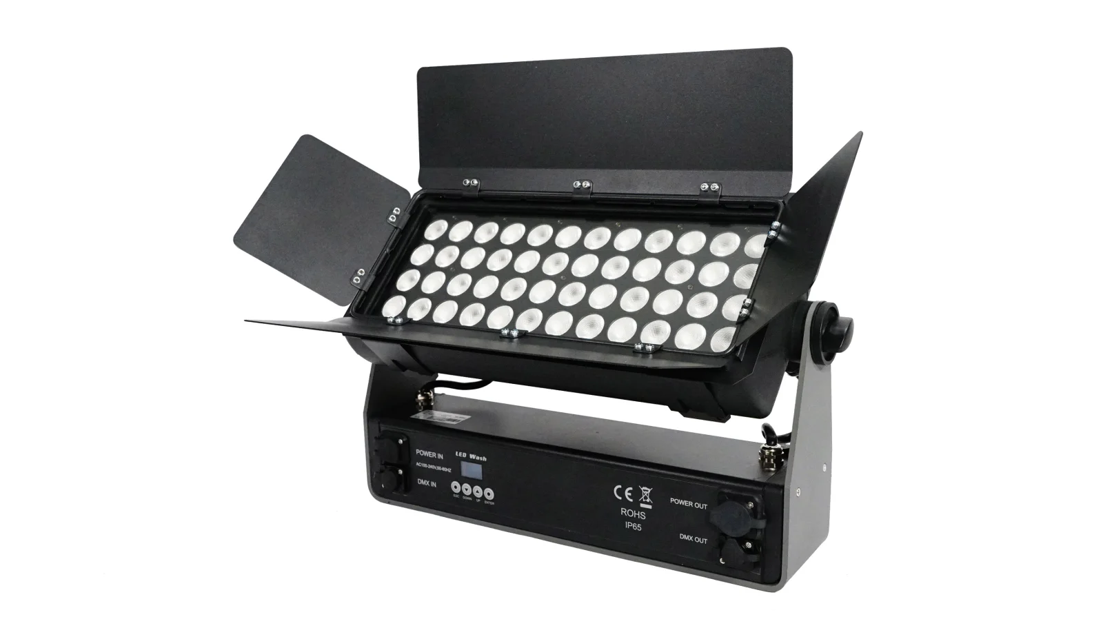 Profesionāls, īpaši spilgts āra IP65 stroboskopiskais/mazgātājs, 48 gaismas diodes, 15 vatu RGBW, 35° optika katrai gaismas diodei, lauka leņķis 120°, lieta tērauda durvis, četru sekciju pikseļu vadība (horizontālas LED grupas), strāvas padeves slēdzis un laikapstākļu izturīga XLR ieeja/izeja, četras dažādas aptumšošanas līknes (lineāra, kvadrātveida, apgriezta kvadrātveida, S veida līkne), automātisks, savrups un DMX512 režīms, svars 14,7 kg.